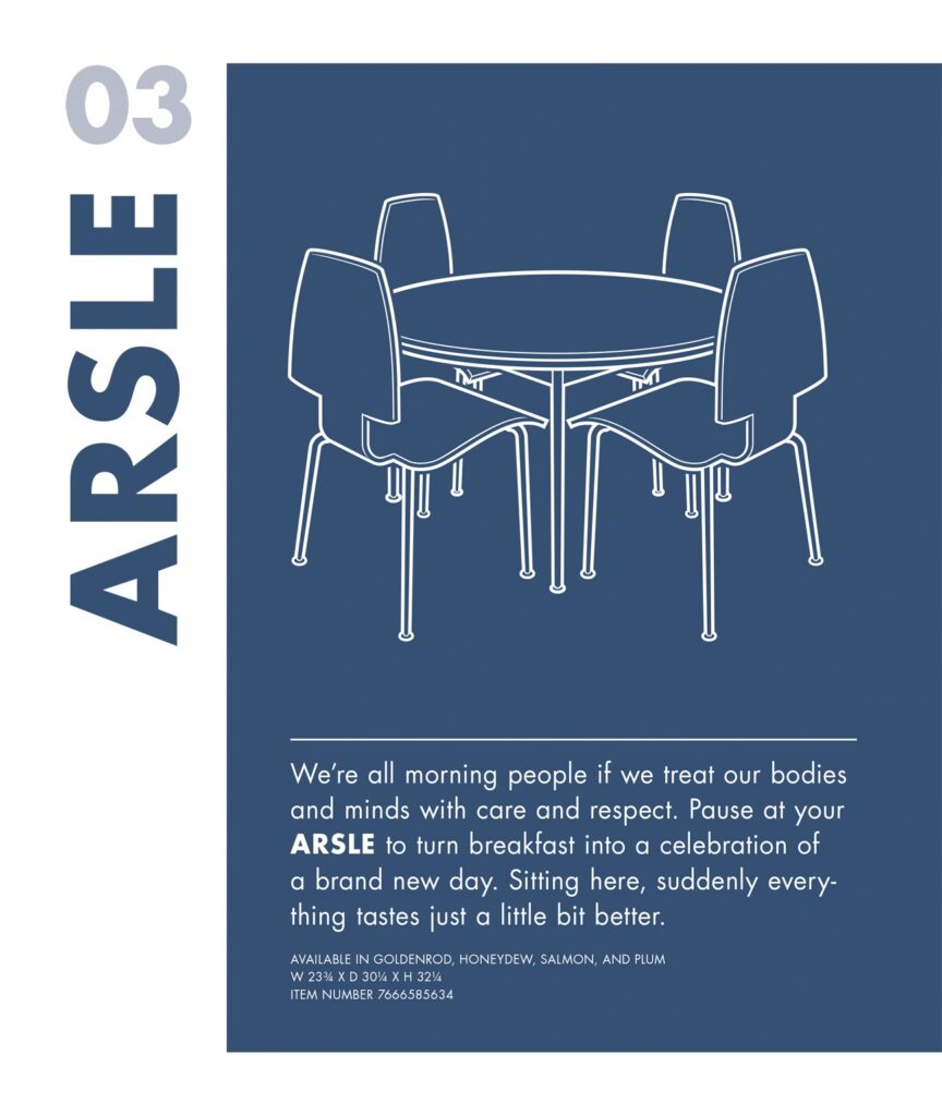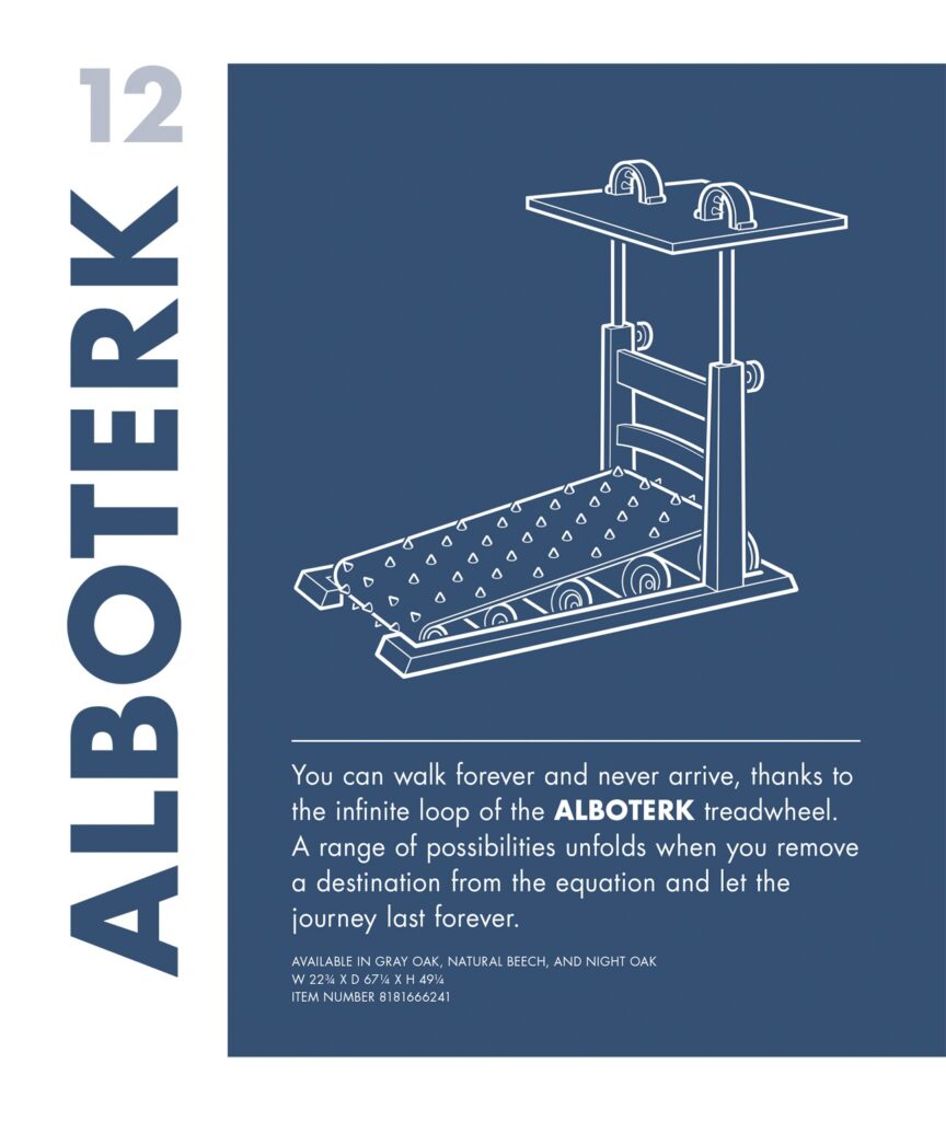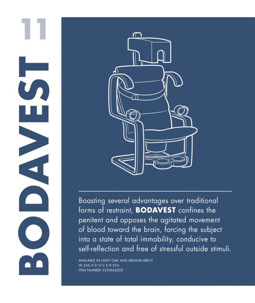 Come ciliegina sulla torta, ad aprire ogni capitolo vi sono le immagini di mobili che si trasformano verso la fine della narrazione in veri e propri strumenti di tortura, anch’essi corredati di testo pubblicitario che ne mette in evidenza i pregi.